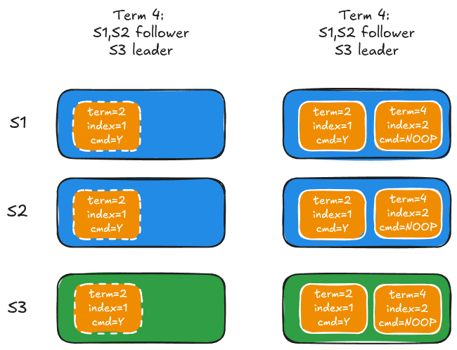 The figure shows how the leader replicates the NOOP to the other node. Since NOOP’s term is the same as the current term of the leader, the leader can commit without facing the risk of losing the command in the future.