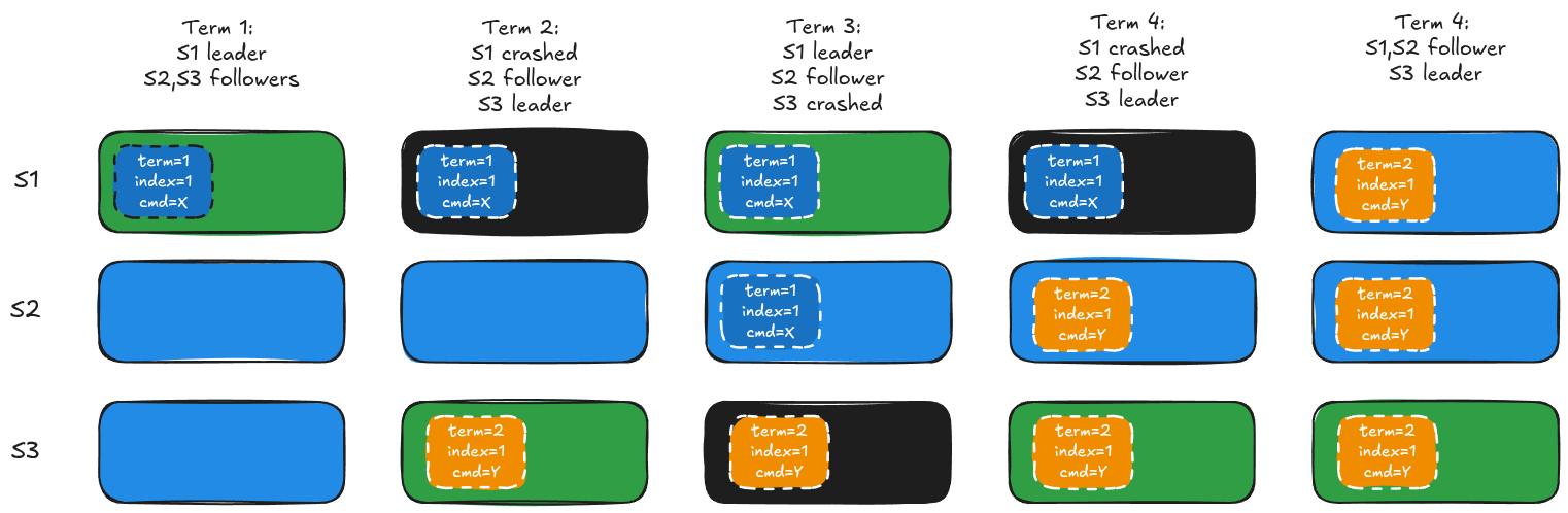 Now, we can discuss the next question. Raft allows only a leader to consider an entry committed if it is in the current term and replicated on a majority. In term 4, from the previous figure, the server S3 has its entry replicated to a majority, but still can’t commit the command because the latest entry is from term 2.