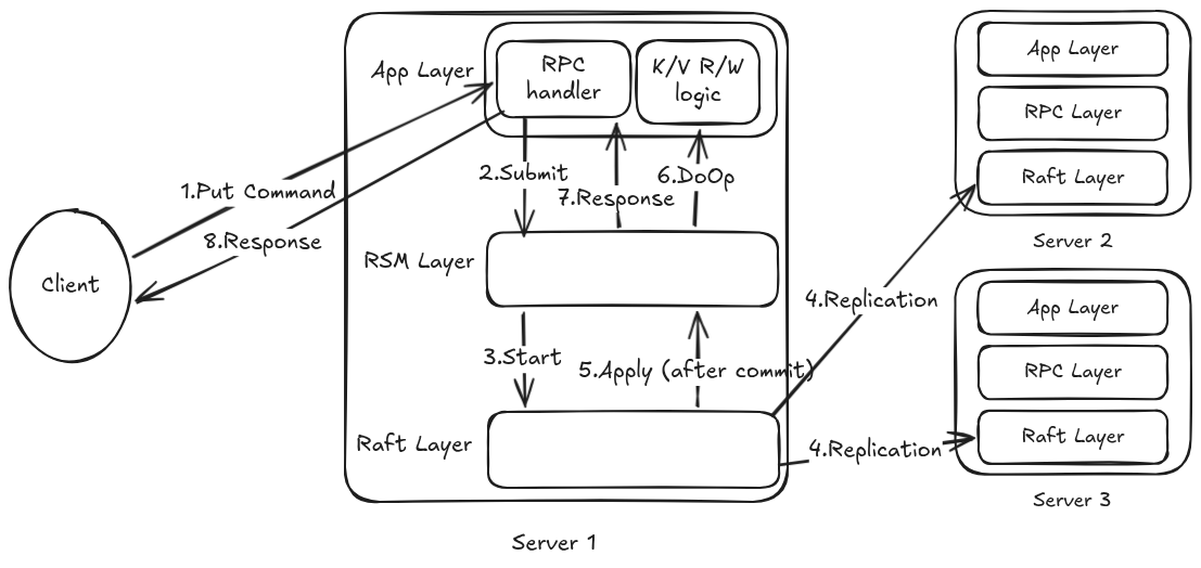 The RSM layer is the glue between the Application layer and the raft layer. When a request is submitted from the application layer, the request will be forwarded to the RAFT layer. The RSM also monitors the apply Channel. When Raft decides to commit a command, the RSM layer forwards the command to the application layer to execute it.